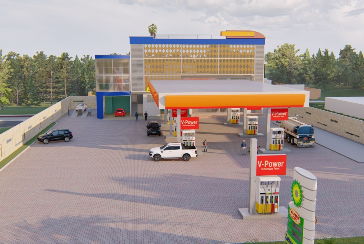 Explore a modern fuel service station design offering a functional layout with multiple fueling points, a spacious canopy, and organized parking to enhance customer experience and safety.
